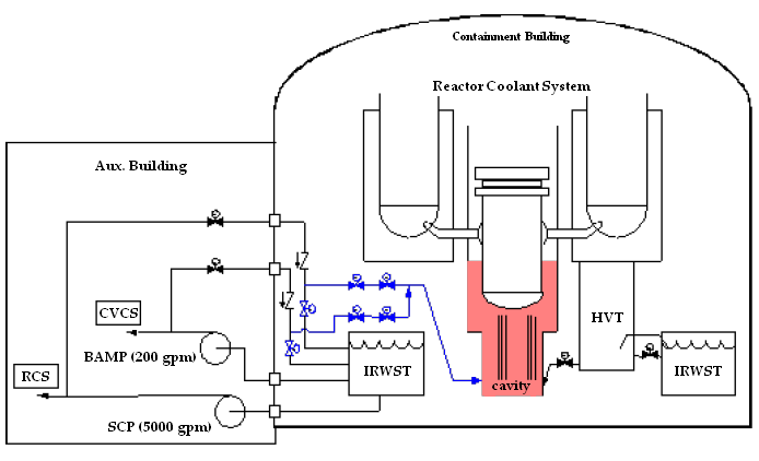 Un dettaglio 3D dei maggiori componenti del circuito primario ed uno schema del sistema di raffreddamento del reattore APR-1400 con in evidenza la cavità facente parte del Cavity Flooding System. Questo sistema funziona grazie alla forza di gravità e permette il raffreddamento dall’esterno del recipiente del reattore nonchè, in caso di rottura del contenitore con fuoriuscita di materiale fuso, il rapido abbatimento della temperatura tramite immersione in acqua borata, evitando l’interazione diretta con il calcestruzzo dell’edificio di contenimento. Il CFS comunica con l’IRWST (In-containment Refuelling Water Storage Tank), una cisterna che corre tutt’attorno al reattore formando un grosso anello, e l’HVT (Holdup Volume Tank).