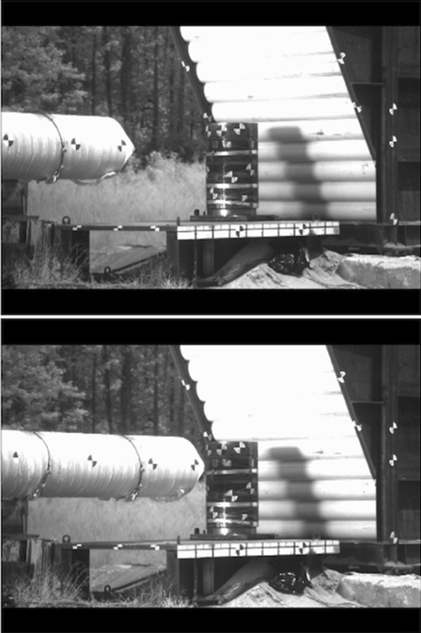 Fig. 2 Due fotogrammi ripresi ad alta velocità dove si vede il missile in procinto di colpire il modello in scala di un cask HI-STAR 180.