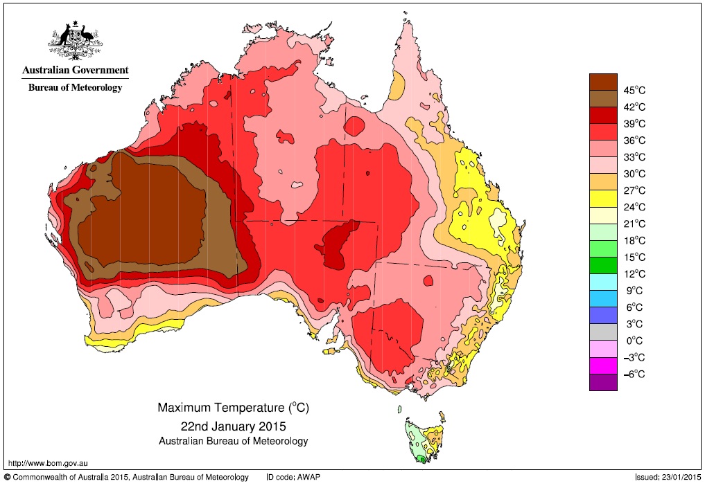 Fig.1: Mappa delle temperature massime (valori medi) – Fonte: Ufficio meteorologico del Governo australiano