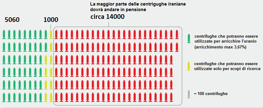 Con il Joint Comprehensive Plan of Action – che è il risultato dei negoziati di Losanna svoltisi tra il 26 marzo ed il 2 aprile di quest’anno – l’Iran ha accettato, tra le altre cose, che nel corso dei prossimi 15 anni non arricchirà l’uranio al di sopra del 3,67% [2], e non terrà stoccati più di 300 kg di uranio arricchito – dovrà quindi sbarazzarsi di circa il 97% delle sue scorte attuali che ammontano più o meno a 10 tonnellate.