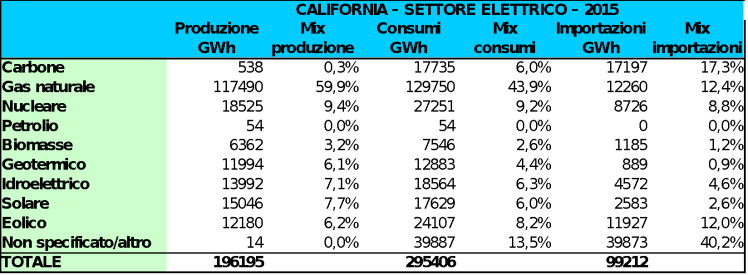 un terzo dei consumi elettrici californiani, nel 2015 è stato coperto con energia elettrica d’importazione. Fonte www.energy.ca.gov
