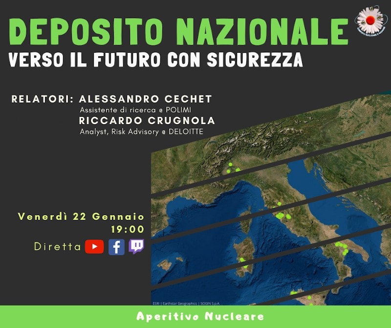 Questo venerdì 22 Gennaio saremo in diretta per rispondere a tutte le vostre domande sul Deposito Nazionale dei rifiuti radioattivi e il Parco Tecnologico. Interverranno l’ing. Riccardo Crugnola, Analyst e Risk Advisory presso l’azienda Deloitte, e l’ing. Alessandro Cechet, assistente di ricerca presso il Politecnico di Milano.