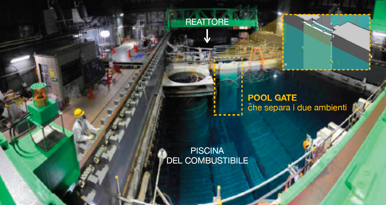 Proviamo prima a capire meglio come è fatta la piscina del combustibile ed il suo collegamento al reattore. Esiste effettivamente un sistema di guarnizioni (gate seals) che assicura la tenuta idraulica della pool gate, ovvero la porta che mette in collegamento la piscina ed il reattore [6]. Durante le operazione di trasporto del combustibile, questa viene aperta per permettere agli operatori di scaricare il combustibile dal core e riporlo nella piscina. L’11 marzo la pool gate era chiusa, garantendo dunque la separazione tra i due locali pieni di acqua, come mostrato nella foto di Figura 1.