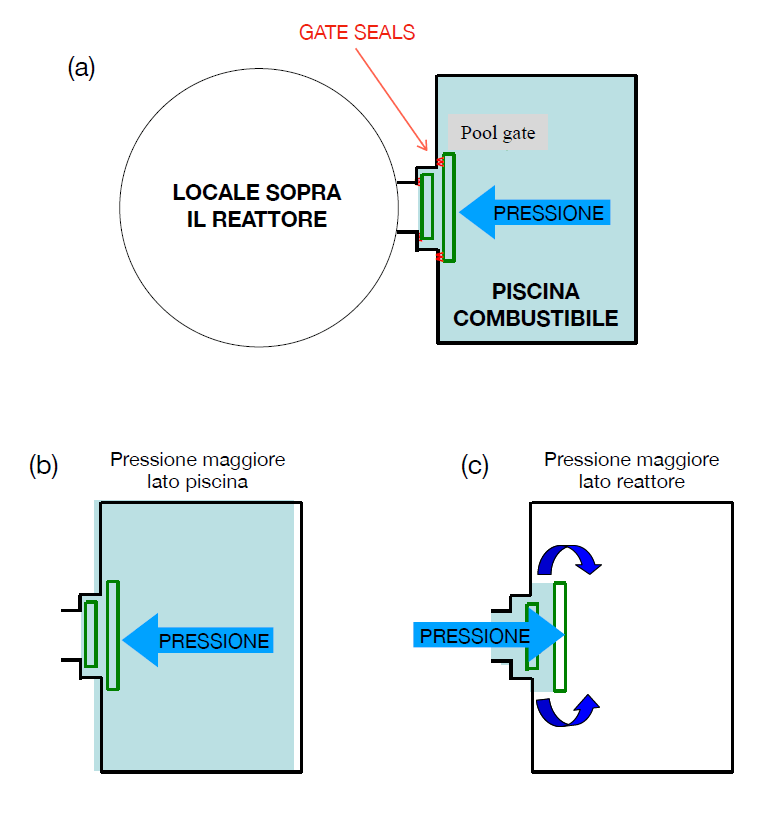 La pool gate deve garantire la tenuta idraulica della piscina del combustibile, ovvero assicurare che l’acqua della piscina non fuoriesca e passi nel locale sopra il reattore, il quale non contiene acqua durante il normale funzionamento. In queste condizioni, la massa di acqua nella piscina assicura la tenuta idraulica, esercitando una pressione sulla gate (Figura 2.a e 2.b). Al contrario, qualora una pressione maggiore fosse esercitata dal lato del reattore, per come è stato costruito il sistema, la tenuta idraulica non sarebbe più garantita.
