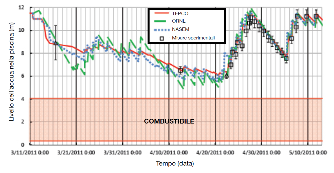 1) Modello illustrato nel report TEPCO 2012 [7] e ripreso con ipotesi simili dalla National Academy of Science, Engineering and Medicine (NASEM) degli Stati Uniti [6]: Si suppone che le vibrazioni causate dal terremoto e l’impatto dell’esplosione dell’edificio abbiano causato complessivamente una diminuzione, pressoché istantanea, del livello dell’acqua di 1,5 m. Queste ipotesi, seppur verosimili, non sono state confermate né da misurazioni né da osservazione diretta da parte degli operatori della centrale. Inoltre il modello suppone un flusso di acqua in ingresso alla piscina causato dalla perdita di tenuta idraulica della pool gate.
