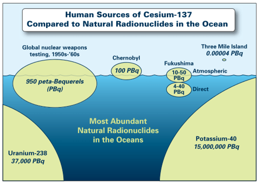 Per quanto riguarda il Cs-137, si stima che il contributo principale agli oceani sia di 950 PBq (1 PBq = 1015 Bq) in seguito ai test nucleari tra gli anni 1945-1963, di 100 PBq in seguito a all’incidente di Chernobyl e di 90 PBq (nel peggiore dei casi) in seguito all’incidente di Fukushima [14]. Il totale si aggira dunque, intorno a 1140 PBq. Il contributo del K-40 è invece di 15000000 PBq! Dunque, se contassimo tutti i decadimenti radioattivi che avvengono nell’oceano, scopriremmo che solamente uno ogni 13000 è causato dall’uomo.