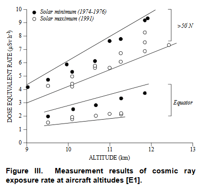 Salendo in quota, il contributo della radioattività terrestre cala rapidamente, ma quello dei raggi cosmici aumenta: arrivati a 10-12 km di altitudine, il rateo di dose oscilla tra 2 μSv/h e 9 μSv/h, quindi da venti a novanta volte il fondo ambientale medio a terra, con valori che variano a seconda della latitudine (più bassi all’equatore e più elevati ai poli), e dei cicli solari, con dosi massime al minimo solare, quando il campo magnetico associato al vento solare è più debole [9].