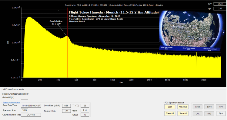 Nel mio ultimo volo intercontinentale prima del COVID avevo con me i miei strumenti portatili per la misura delle radiazioni ionizzanti. Diciamo subito che gli strumenti che comunemente si usano per misurare le radiazioni a terra non sono molto adatti per fare la stessa cosa in quota, perché cambiano sia il tipo di radiazione che i livelli energetici, ma, dovendo passare 11 ore in aria, perché non fare qualche misura?