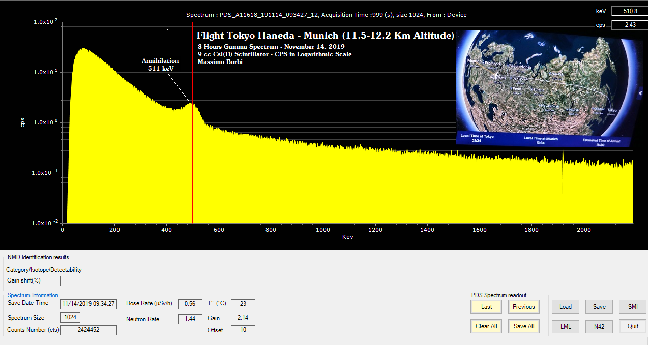 Il mio spettrometro, essendo fatto per rilevare i raggi gamma terrestri, si è ovviamente perso quasi tutta la radiazione che ha incontrato in volo, ma ha comunque rilevato un chiaro picco di annichilazione, fenomeno che si verifica quando un elettrone incontra la sua antiparticella, il positrone, con il risultato che entrambi vengono convertiti in fotoni di energia pari alla massa dell’elettrone (e del positrone): 511 keV. È la firma della presenza di antimateria nei raggi cosmici [10] [11].