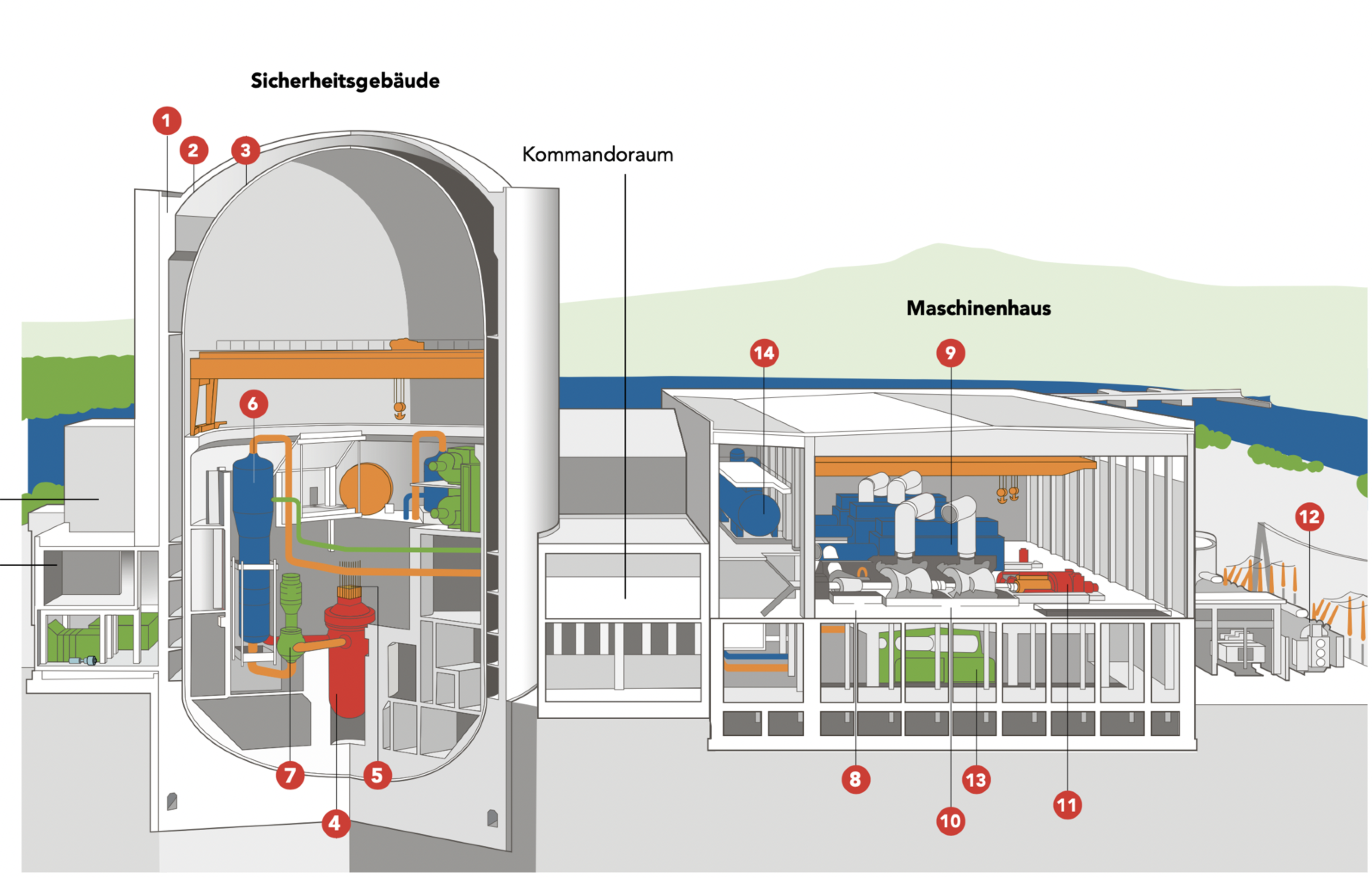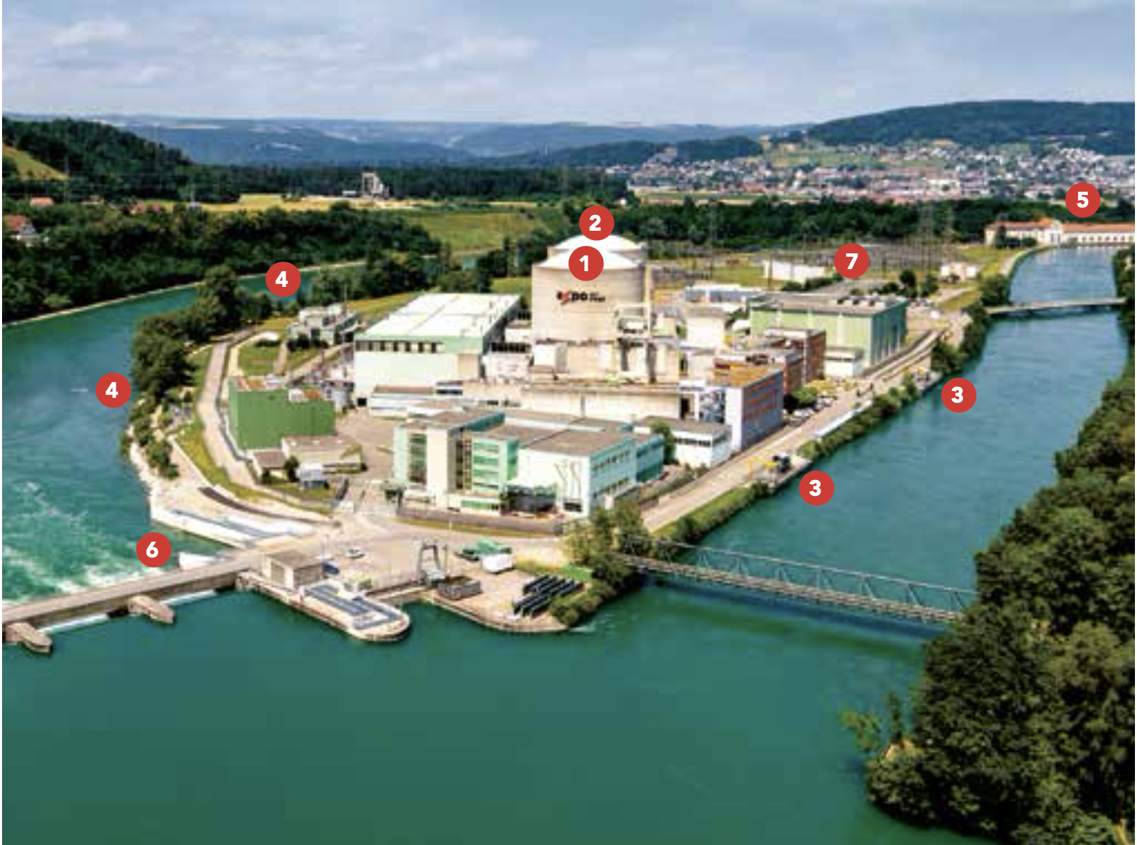 1La centrale, che sorge su un’isola artificiale del fiume Aare, consiste di due reattori ad acqua pressurizzata identici, con una potenza nominale di 365 MegaWatt elettrici (MWe) ciascuno. Essi producono insieme circa 6000 Gigawattora (GWh) all’anno, corrispondenti a due volte il consumo di energia della città di Zurigo. Inoltre la centrale fornisce acqua calda per la rete regionale di teleriscaldamento della bassa valle dell’Aare.