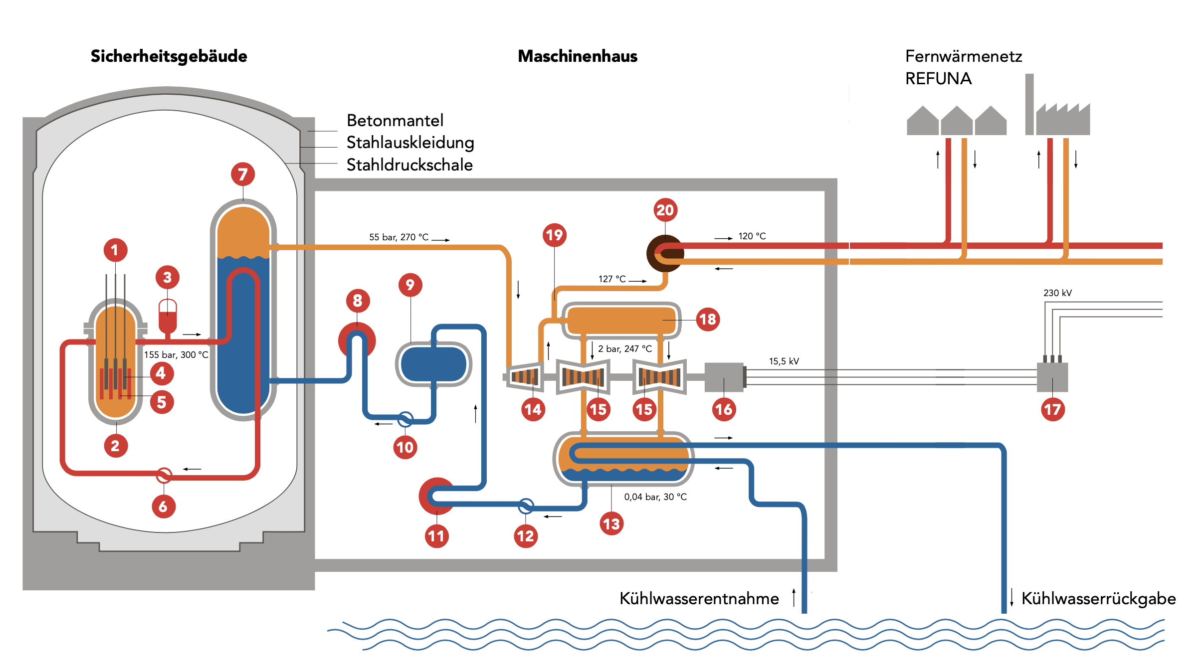Beznau 1 e Beznau 2 sono reattori del tipo ad acqua pressurizzata, caratterizzati da due circuiti separati, chiamati primario (in rosso nella figura seguente) e secondario (in blu nella figura). Nel circuito primario l’acqua in pressione viene riscaldata dagli elementi di combustibile. Nel secondario viene generato il vapore che poi andrà in turbina.