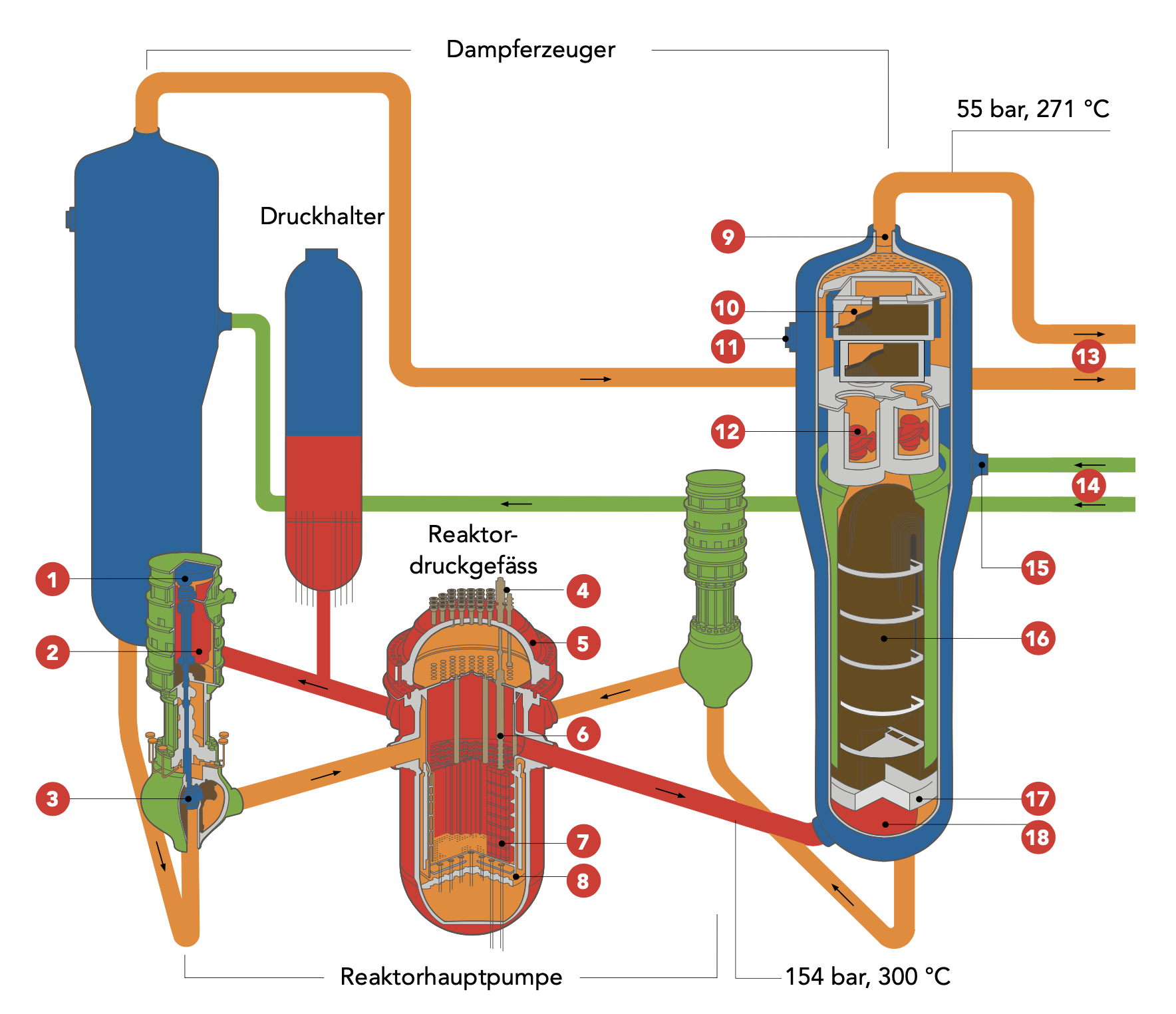Il vapore viene prodotto nei generatori di vapore e poi diretto alle turbine. La pressione e la temperatura sono più basse che nel reattore. La pressione nel circuito primario è sufficientemente alta (154 bar) da impedire che l’acqua riscaldata dagli elementi di combustibile (131 per ogni reattore) raggiunga l’ebollizione, anche a una temperatura di funzionamento di 300 °C nel nucleo. Il circuito secondario è utilizzato per la generazione di vapore. Il vapore a bassa pressione (55 bar) aziona le turbine con i generatori collegati. Nel condensatore (figura precedente, punto 13) il vapore di scarico si condensa in acqua ed è quindi pronto per un nuovo ciclo.