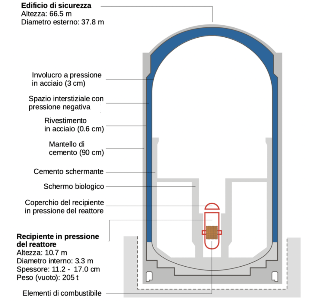 - Edificio di sicurezza del reattore (cilindrico, altezza 66.5 m, diametro esterno 37.8 m) : Doppio contenimento, guscio di pressione in acciaio all’interno, camicia di cemento schermata con rivestimento in acciaio all’esterno, spazio interstiziale mantenuto a pressione inferiore a quella esterna. L’aria di scarico dall’interno (zona controllata) è continuamente monitorata e scaricata all’esterno attraverso un camino di scarico.