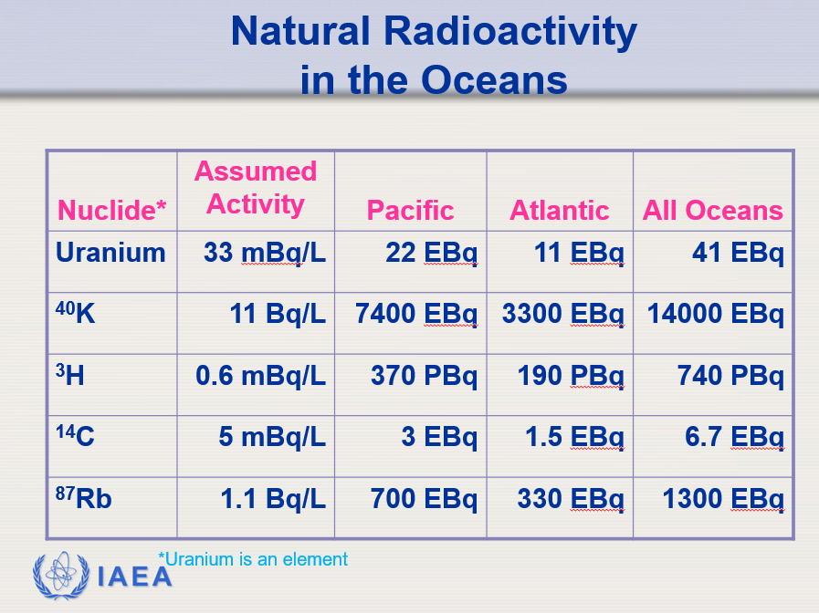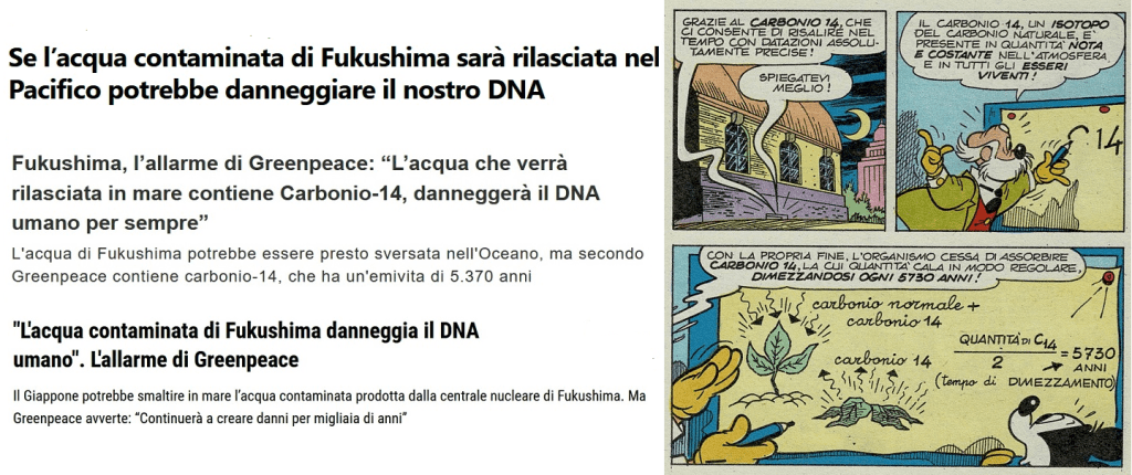 Citazione da uno dei tanti articoli di questi mesi, che prosegue aggiungendo che la “sostanza” ha “un’emivita di 5370 anni” (che in realtà sono 5730, ma lasciamo stare), quindi in pratica contaminerà l’oceano per sempre.