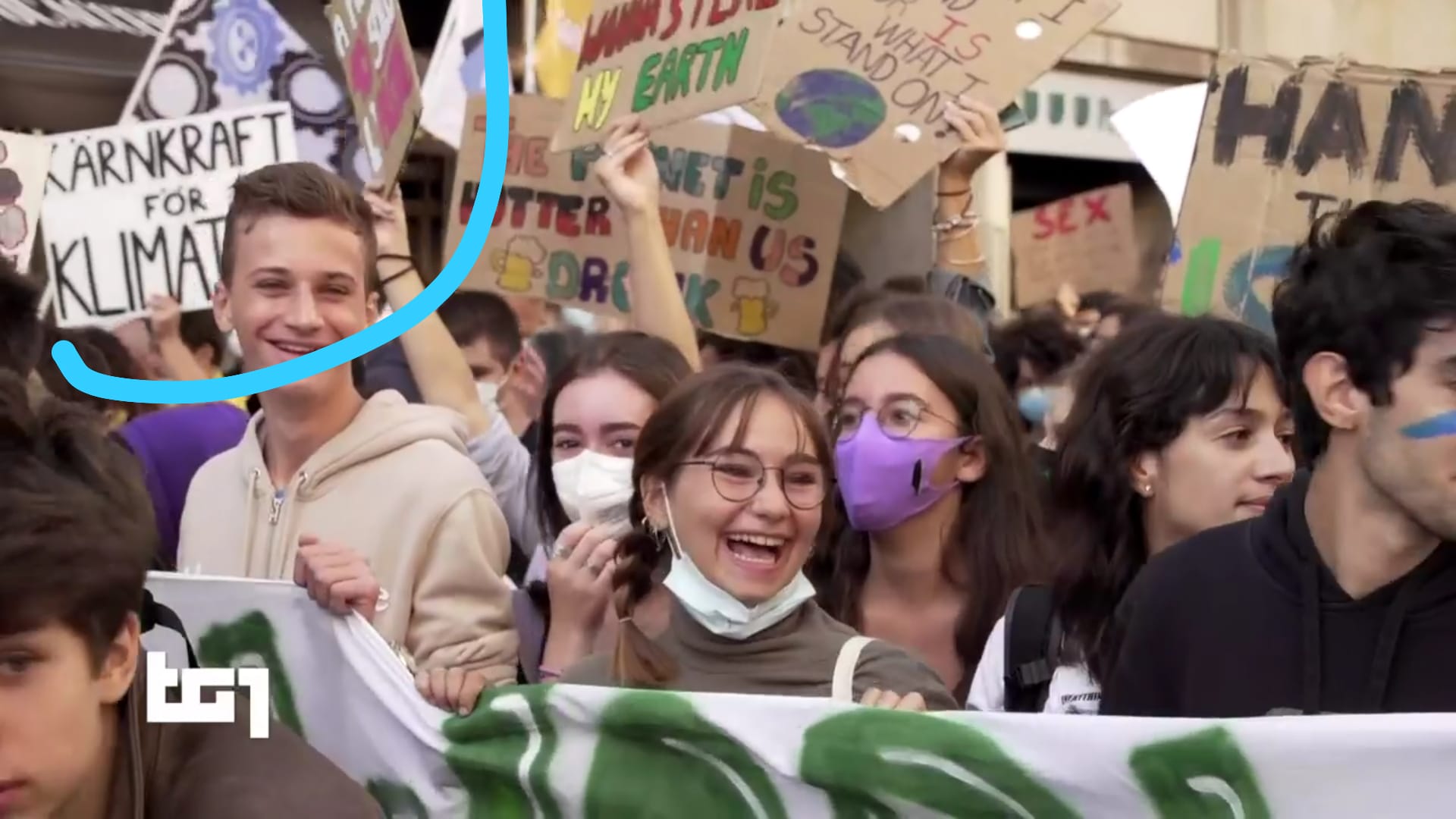 Lorenzo Mazzocco ha 21 anni e studia ingegneria energetica al Politecnico di Milano. “Io ho un’idea molto precisa sul cambiamento climatico: va affrontato in maniera razionale e a sangue freddo: bisogna vedere da dove vengono le emissioni per azzerarle. Le principali emissioni di gas climalteranti oggi vengono dalla produzione energetica. E quindi io ho scelto di fare ingegneria energetica, così posso avere un impatto sulla realtà più forte”. Lorenzo tiene un cartello con il disegno di un atomo, di pianeta e poi la scritta “We are on the same side” (“Siamo dalla stessa parte”)