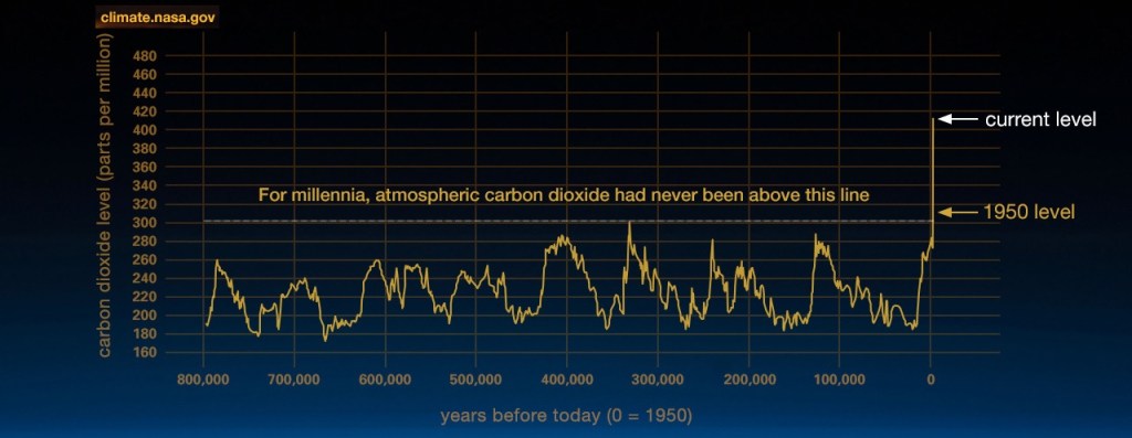 E se ci sembra che quella linea non sia poi tanto ripida, basta inquadrarla nel contesto degli ultimi 800,000 anni (grafico in basso) per renderci conto che, a confronto con quanto accaduto in passato (per cause naturali), stiamo assistendo ad un’impennata praticamente verticale.
