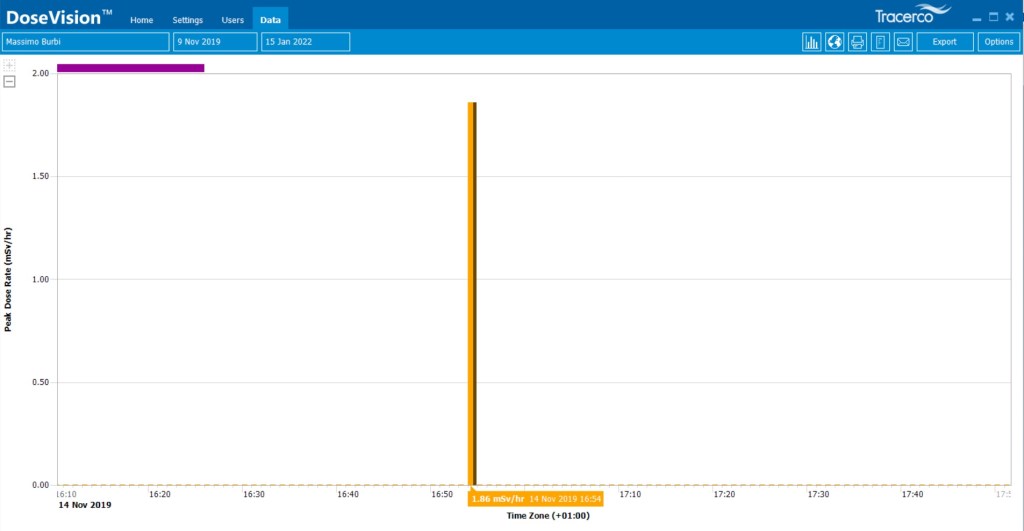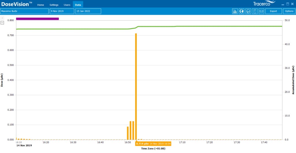 Un rateo di dose 15 volte più alto che a terra fa la sua figura, ma è niente rispetto a quello che stavo per misurare da lì a poco. Scendendo dall’aereo il dosimetro è sempre rimasto acceso, e quando, pochi minuti dopo, l’ho ripreso in mano, mi sono ritrovato sul display un rateo di dose di picco di 1860 μSv/h, oltre 300 volte i valori medi registrati in volo, e circa 5000 volte quelli medi a terra. Esposti a radiazioni così intense si prende la dose di un anno in meno di due ore.