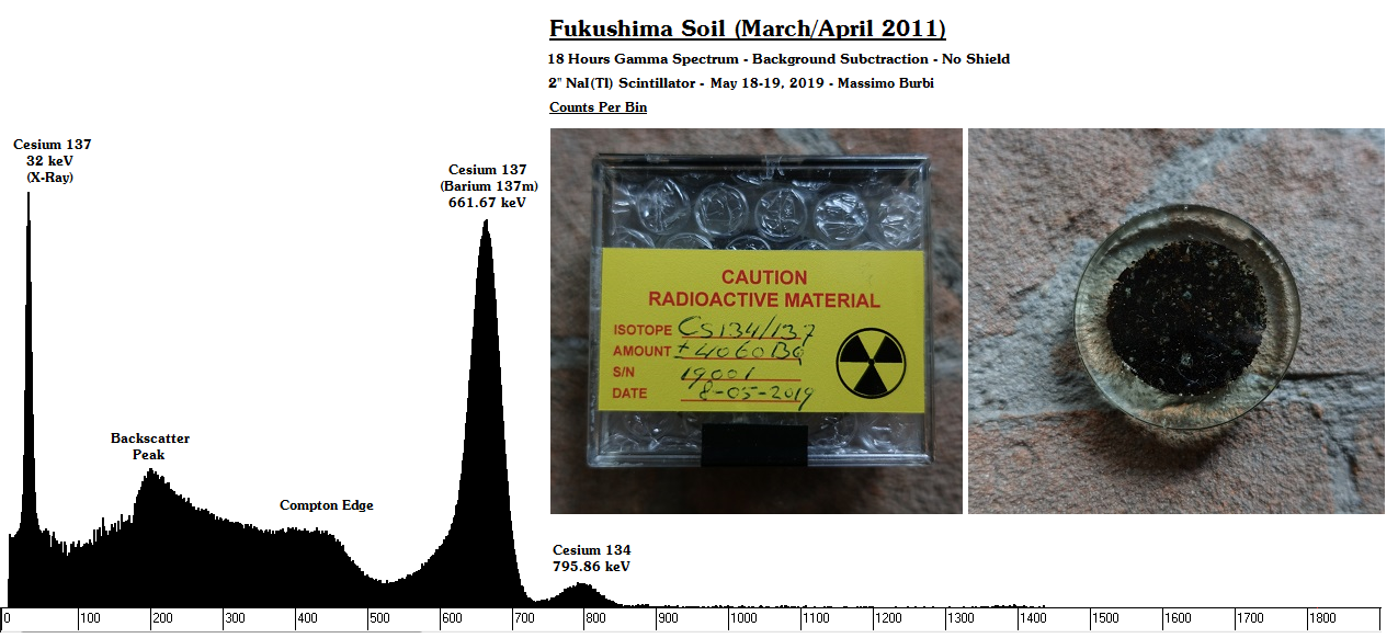Quello qui sotto è lo spettro gamma di un campione di suolo contaminato misurato nel 2019, anche senza sapere da dove proviene c’è un indicatore certo per stabilire che si tratta di contaminazione da Fukushima e non da Chernobyl: la presenza ancora ben visibile di uno dei picchi di Cesio 134.