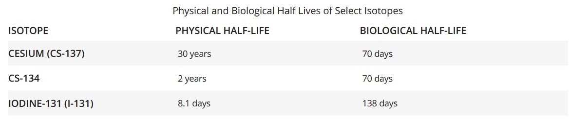 Ad esempio il Cesio 137 ha un tempo di dimezzamento di 30 anni e un tempo di dimezzamento biologico di circa 70 giorni [5], il che vuol dire che abbandona l’organismo avendo rilasciato solo una piccola parte delle sue radiazioni.