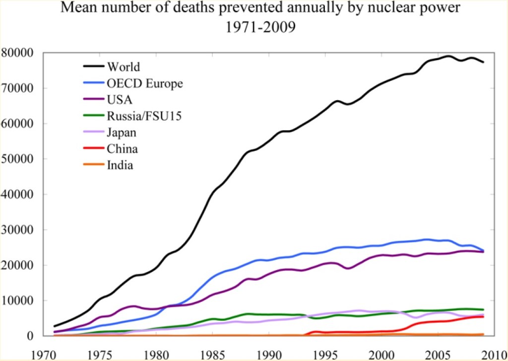 Su scala mondiale è stato stimato che l’uso dell’energia nucleare tra il 1971 e il 2009 abbia evitato circa 1.8 milioni di morti premature (con una media di 76,000 all’anno tra il 2000 e il 2009) che sarebbero avvenute se quella stessa energia elettrica fosse stata prodotta con fonti fossili (grafico a destra) [11].
