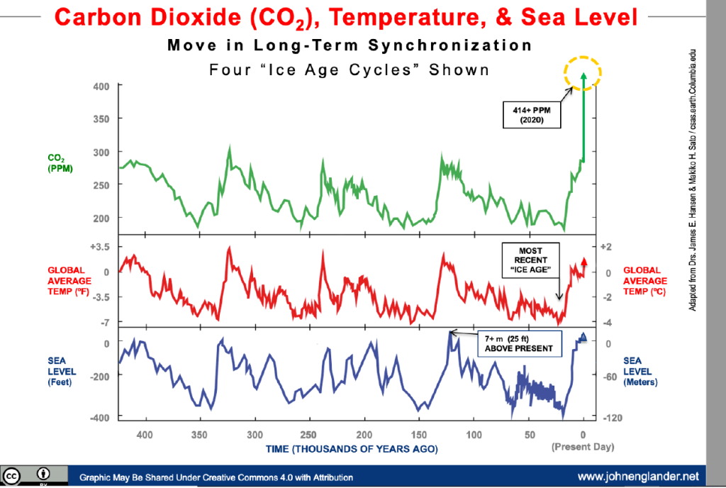 Cominciamo da qui: la CO2 è il termostato del nostro pianeta, per centinaia di migliaia di anni non ha mai superato le 300 ppm, prima che iniziassimo a bruciare combustibili fossili se ne stava tranquilla intorno alle 280 ppm [2], in poco più di un secolo siamo riusciti a portarla a livelli che non si vedevano sulla Terra da più di 3 milioni di anni, significa che stiamo entrando in una fase che non ha precedenti nella “breve” storia della nostra specie, che esiste da circa 200,000 anni e ha iniziato ad avere insediamenti stabili “solo” 10,000 anni fa (circa) [3].