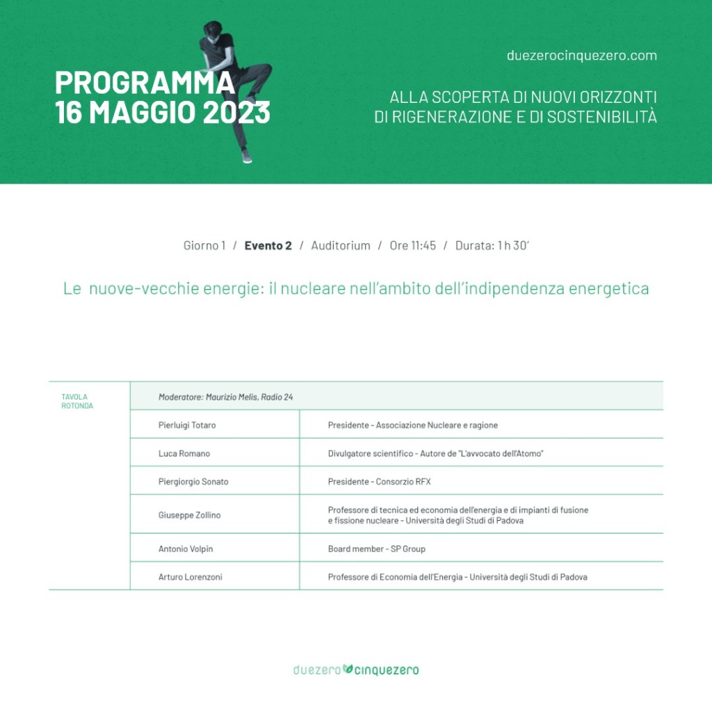 Tra i numerosi eventi in programma, tutti di assoluto rilievo, menzioniamo in particolare la tavola rotonda intitolata “Le nuove-vecchie energie: il nucleare nell’ambito dell’indipendenza energetica”, che si terrà il 16 maggio alle 11:45, e alla quale parteciperanno: