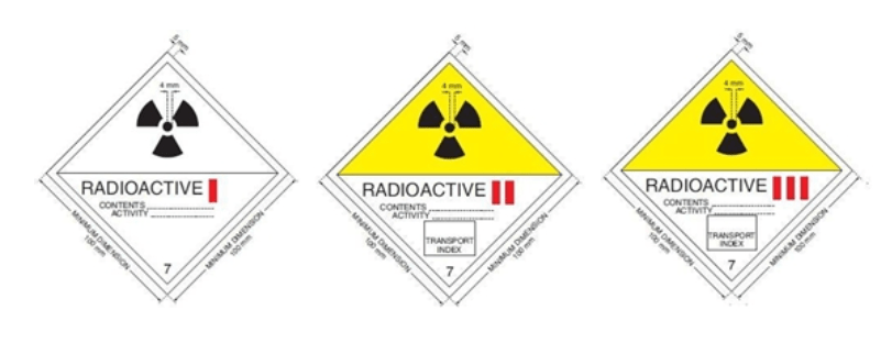 Sull’etichetta devono essere riportati anche il nome o simbolo chimico del radionuclide e la sua attività, come visibile nell’immagine sotto. I materiali di debole attività specifica o contaminati superficialmente devono essere indicati.