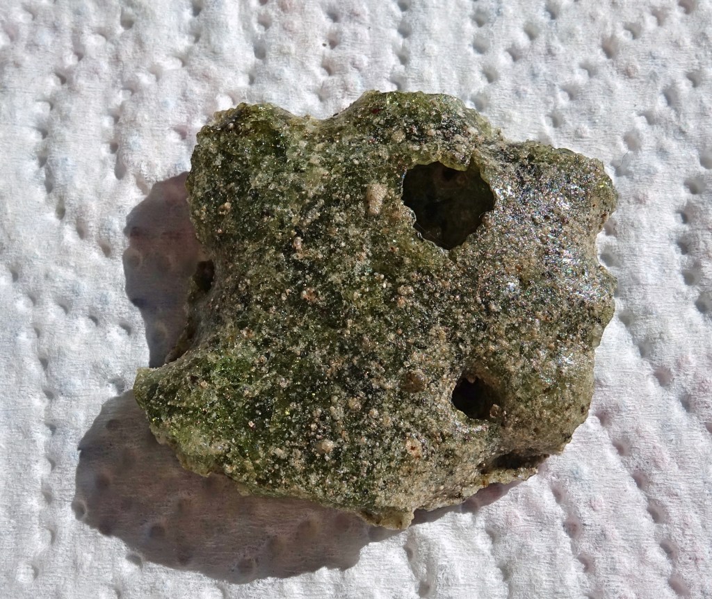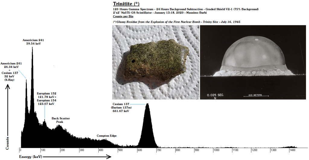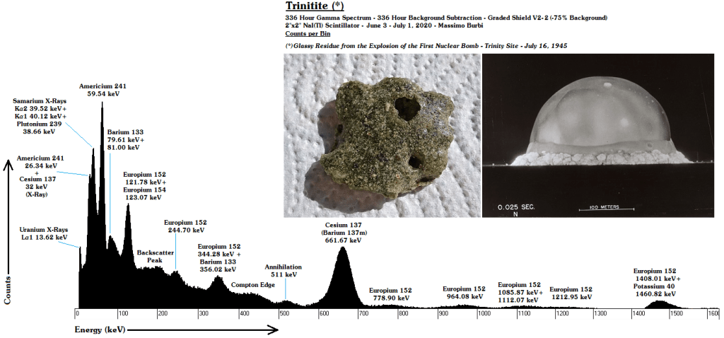Negli anni ho messo insieme una decina di campioni di Trinitite. Quasi tutti hanno un lato vetroso (quello che era rivolto verso l’alto) e uno sabbioso, con il primo più radioattivo del secondo. Tutti hanno un picco gamma molto pronunciato di Cesio 137, prodotto di fissione con un’emivita abbastanza lunga (30 anni) da essere arrivato forte e chiaro fino a noi e di Americio 241, prodotto direttamente dal Plutonio 239 inesploso della bomba per doppia cattura neutronica e successivo decadimento beta [15].