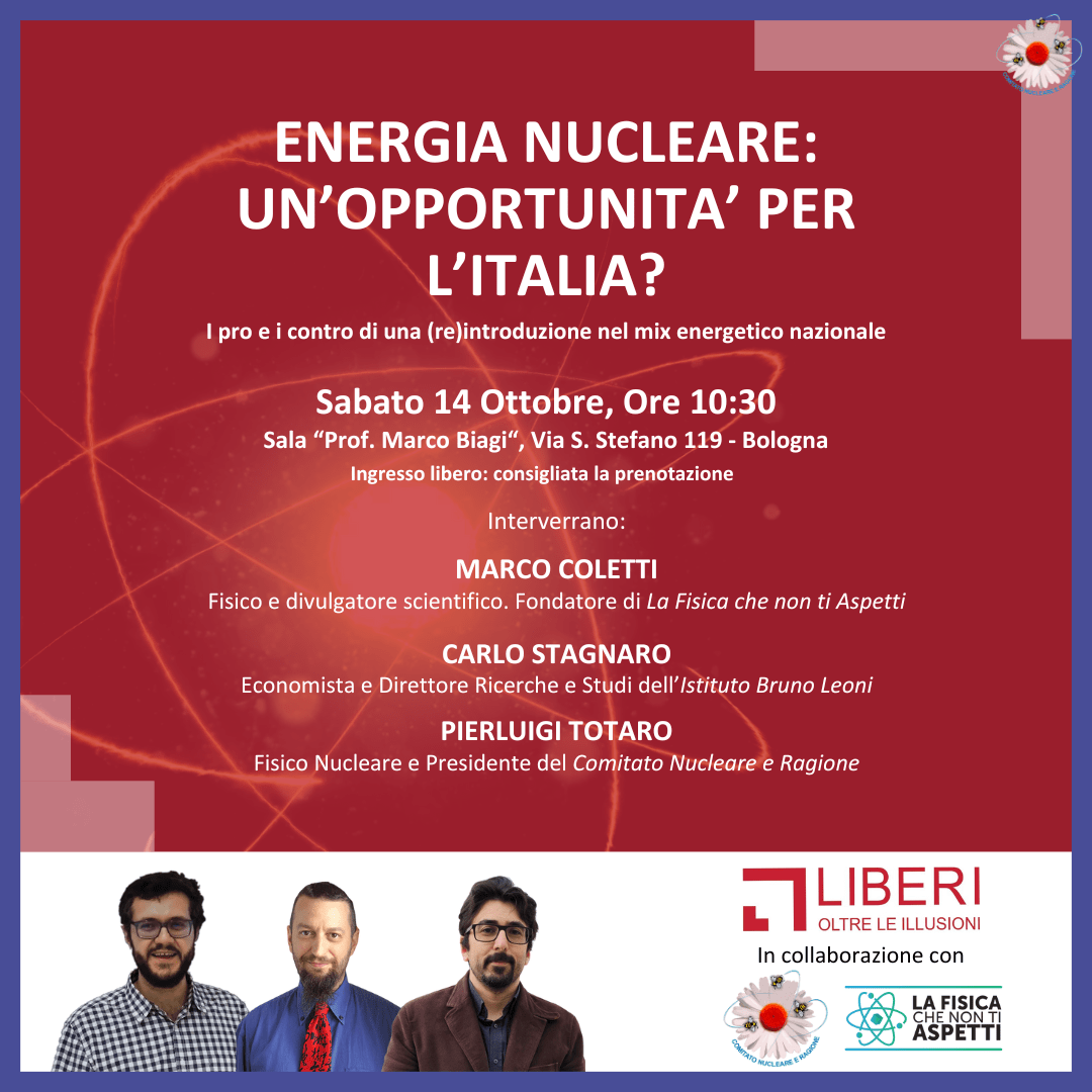 Si svolgerà questo sabato a Bologna, presso la sala “Prof. Marco Biagi” in via S.Stefano 119, una tavola rotonda dedicata all’energia nucleare, promossa dall’associazione Liberi Oltre le Illusioni.