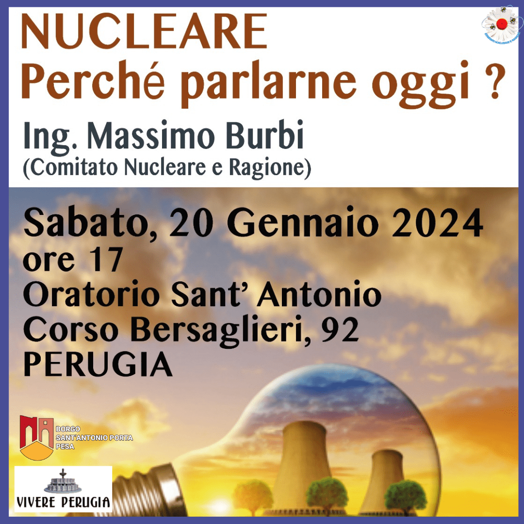 Sabato 20 Gennaio alle ore 17:00, presso l’Oratorio Sant’Antonio di Perugia, in Corso Bersaglieri n.92, si svolgerà un evento sull’energia nucleare promosso dalle associazioni “Vivere Perugia” e “Borgo Sant’Antonio Porta Pesa”.