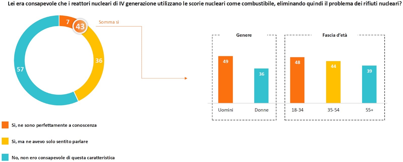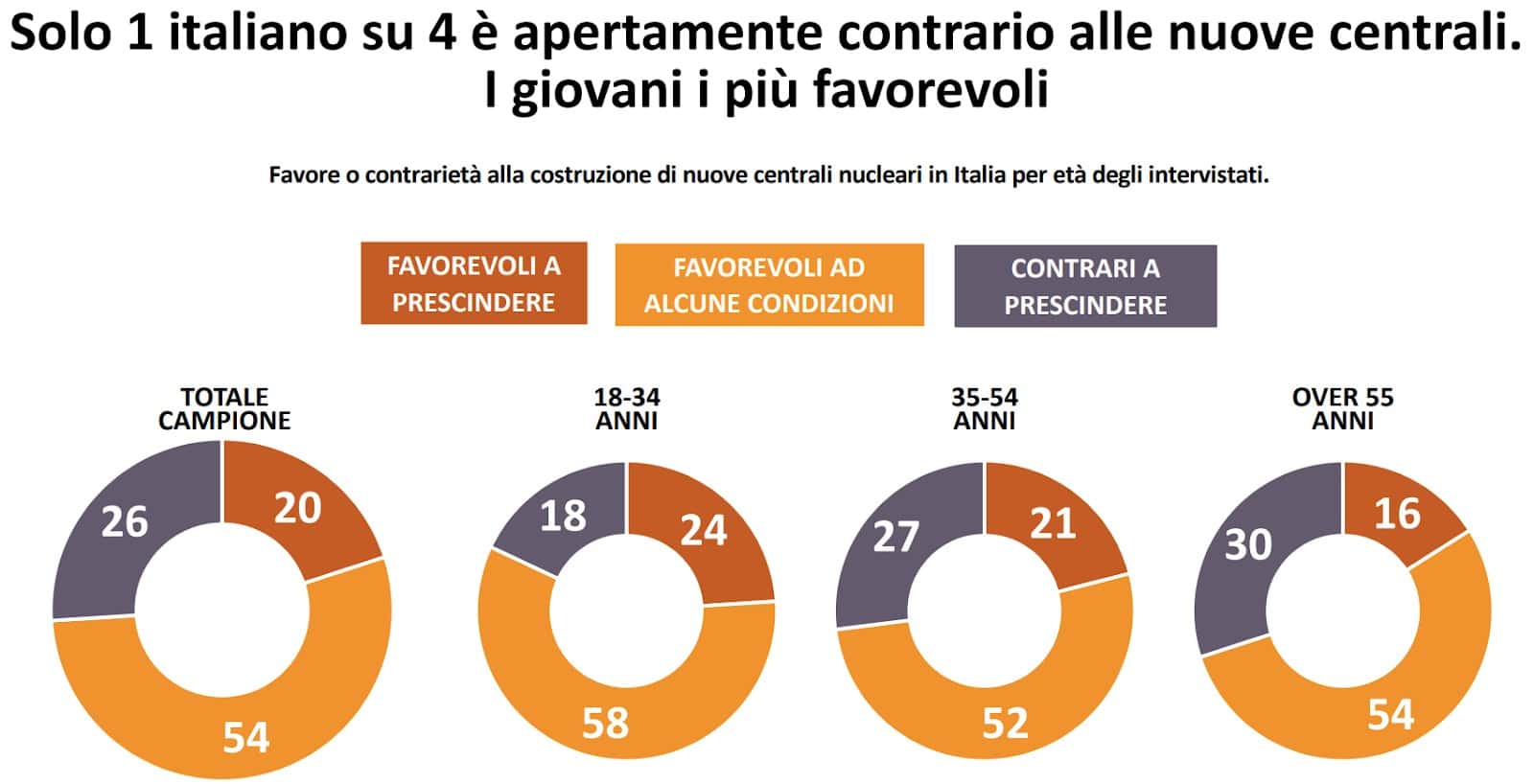 Prima di addentrarsi nell’analisi dei risultati ci sembra necessario sottolineare che in molte delle domande poste agli intervistati viene utilizzata la dicitura “nuovo nucleare”, una terminologia che in assenza di ulteriori specificazioni può influenzare le risposte, soprattutto se si fa riferimento a persone poco informate sull’argomento. Questa perifrasi ed altre simili (“nucleare sostenibile”, “moderno nucleare”, “nuovo nucleare”) sono diventate molto comuni nel recente dibattito pubblico e politico italiano (per esempio con le parole dell’attuale Ministro dell’Ambiente e della Sicurezza Energetica Pichetto Fratin), la volontà sembra essere quella di aggirare la diffidenza per il “vecchio” nucleare ancora presente in una parte del pubblico, in particolare nei meno giovani. Questa strategia rischia però di sminuire la generazione nucleare III+ attualmente commerciale e diffusa oltre che, come già detto, influenzare le risposte dei meno esperti.