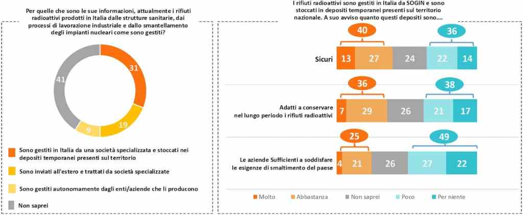 Infine, per quanto riguarda i rifiuti radioattivi, la maggioranza degli italiani ha una scarsa conoscenza della situazione attuale e crede nella sicurezza delle tecnologie di stoccaggio. Tuttavia anche in questo caso è molto forte l’effetto NIMBY: il 66% rimane preoccupato da qualsiasi deposito nell’arco di 100km (definitivo o temporaneo).