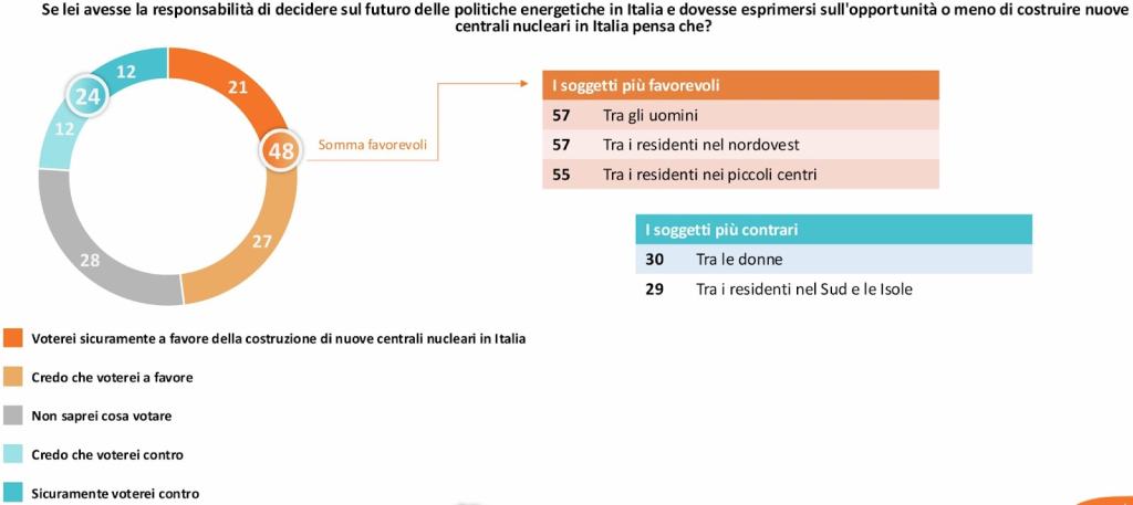 Mentre il secondo quesito, che esamina direttamente le opinioni in merito agli “impianti nucleari di nuova generazione come possibile fonte di energia per garantire al Paese una riduzione delle emissioni e una maggiore autonomia energetica“, mostra che: