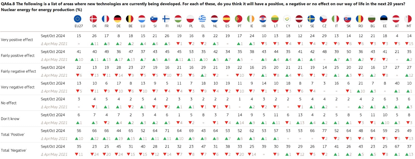 Per quanto riguarda il confronto con i risultati del 2021, a livello aggregato nell’UE 27 si riscontra un significativo aumento delle opinioni positive (+10 punti) e diminuzione di quelle negative (-11 punti) che riporta le risposte in linea con quelle dell’indagine del 2005 (prima dell’incidente di Fukushima Daiichi) (qui i risultati del report del 2021 che confronta con quelli del 2005).