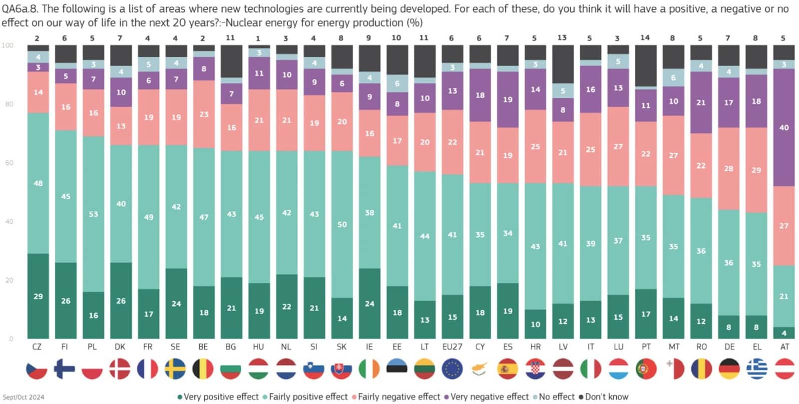 Per quanto riguarda l’uso dell’energia nucleare per la produzione di energia, a livello aggregato nell’UE 27 il 56% degli intervistati ritiene che avrà un effetto positivo, sommando il 15% di “molto positivo” ed il 41% di “abbastanza positivo”, mentre il 35% esprime invece un giudizio negativo, sommando il 13% di “molto negativo” ed il 22% di “abbastanza negativo”.