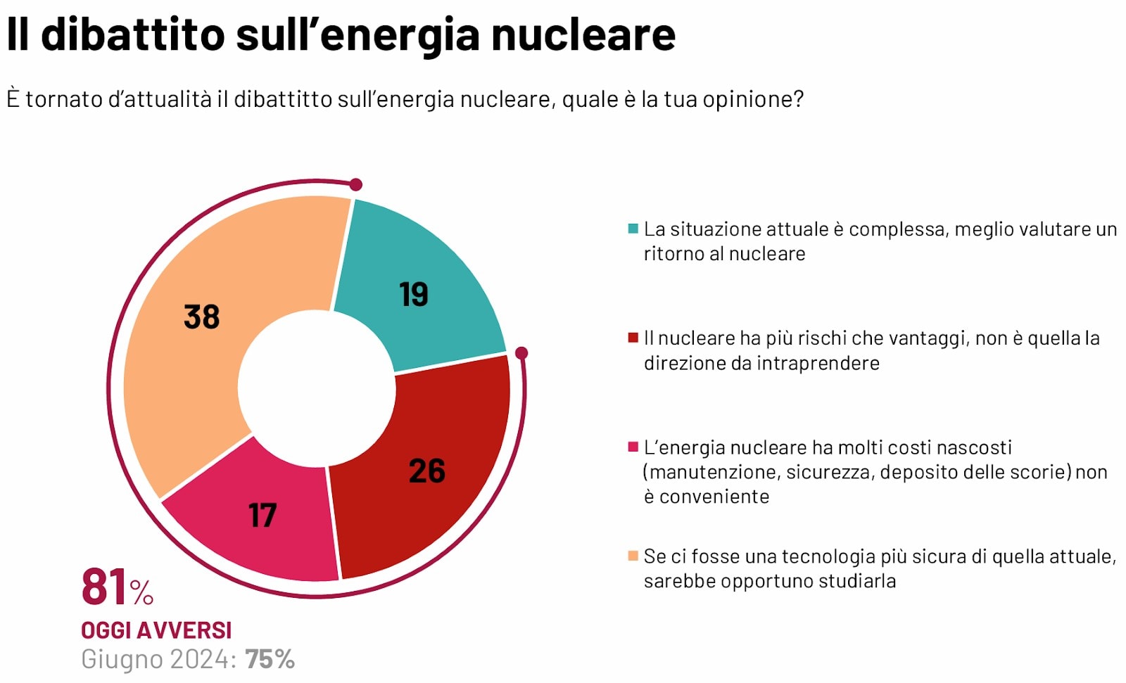 In conclusione, analizzando complessivamente i vari sondaggi e tenendo conto delle criticità dell’ultimo citato, riteniamo più che corretto contrastare affermazioni come “l’81% degli italiani non vuole un ritorno al nucleare”. Siamo altresì consapevoli che rimane ancora molto lavoro da fare sul fronte della divulgazione e dell’informazione, e che guadagnare il consenso e la fiducia di gran parte degli italiani rimane una sfida considerevole.