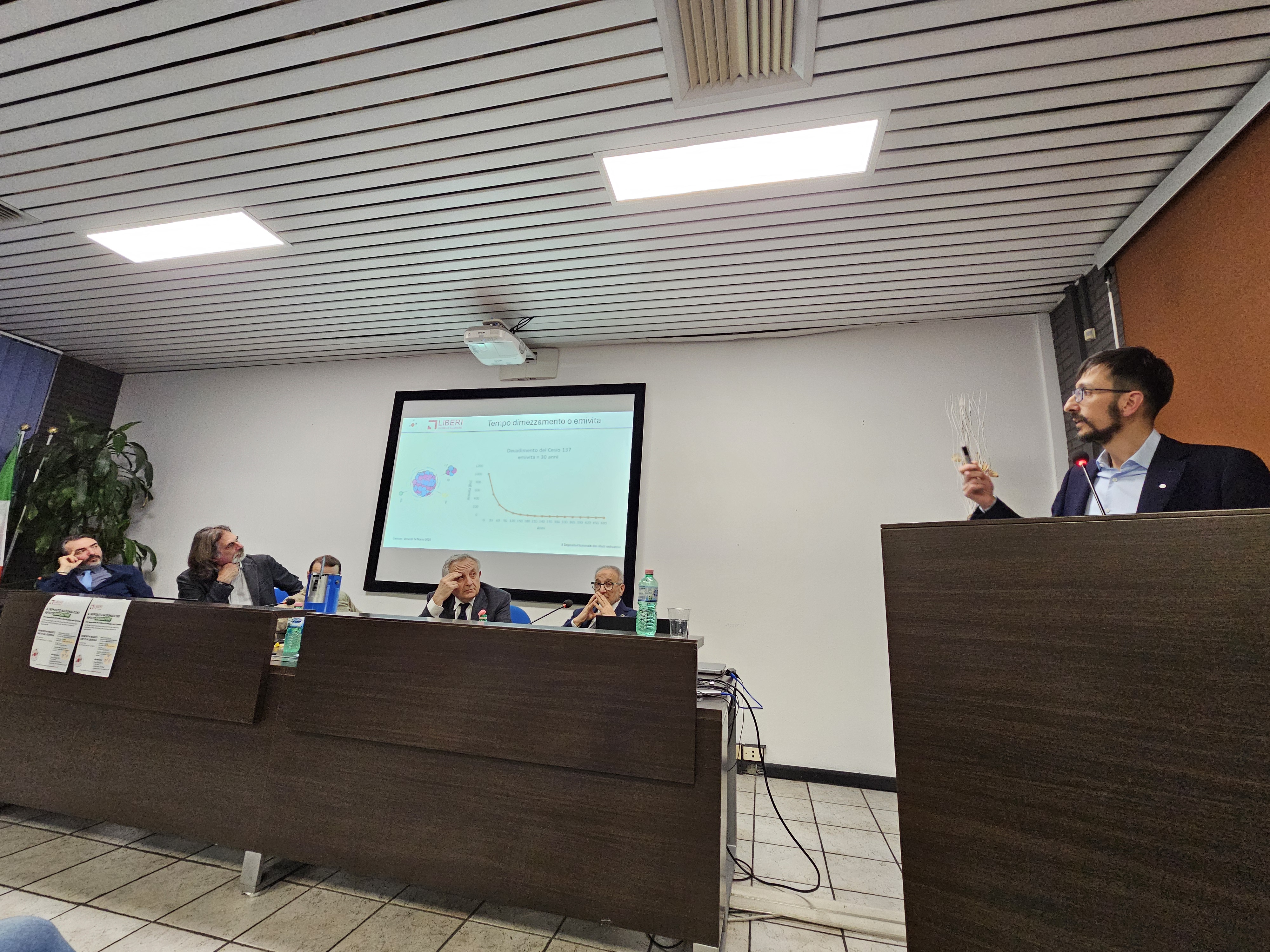 I lavori sono stati aperti dal nostro socio Alessandro Sardo, che in qualità di esperto di decommissioning, ha introdotto i concetti base per la piena comprensione del fenomeno radioattività, come il tempo di decadimento, gli effetti delle radiazioni sul corpo umano, i valori del fondo di radioattività naturale e le tipologie di rifiuti radioattivi esistenti, con particolare riferimento alla situazione italiana e all’impietoso confronto dimensionale con gli altri rifiuti prodotti dal resto delle attività umane, evidenziando come i rifiuti radioattivi siano relativamente pochi, facilmente tracciabili e di pericolosità decrescente nel tempo.