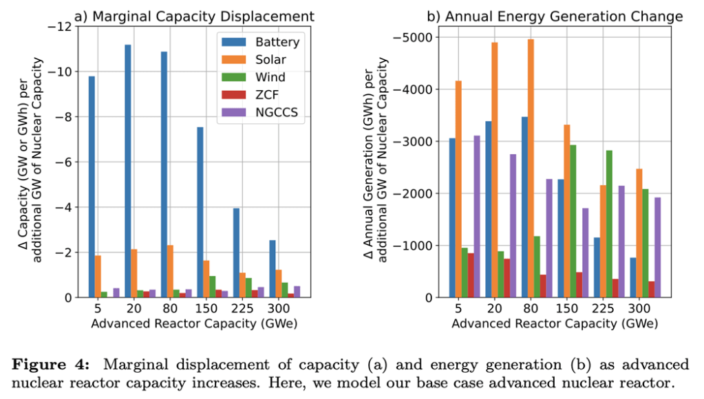 Uno studio recente esemplifica questo concetto per il nucleare, quantificando costi e benefici per l’interconnessione orientale negli Stati Uniti. Sebbene mirati a valutare la competitività di nuovi reattori, i risultati operativi del dispacciamento sono significativi a questa discussione, poiché evidenziano i compromessi tra 1 GW di nucleare e il portafoglio di risorse che sostituisce: secondo la classificazione di Jenkins, le “fuel saving” (le rinnovabili intermittenti), le batterie a “risposta rapida” e CCGT e OCGT “stabili”. Per essere più economico a livello di sistema, la somma dei costi per capacità e energia deve essere inferiore alle spese delle risorse rimpiazzate.