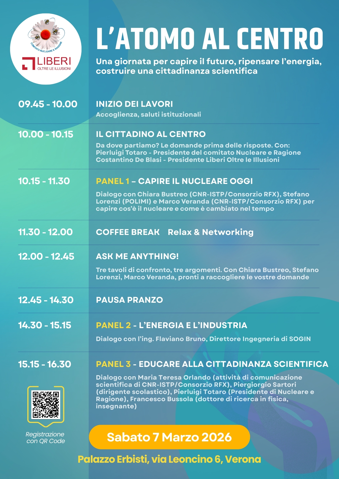 Un evento aperto a cittadini, studenti, insegnanti e professionisti per orientarsi nel presente dell’energia nucleare, dialogare con ricercatori e divulgatori, e riflettere sul ruolo della scienza nella società. Panel, momenti di confronto diretto, spazi di discussione libera e interventi di esperti: un’intera giornata per fare chiarezza, porre domande e partecipare in modo consapevole alle scelte che riguardano il nostro futuro energetico.