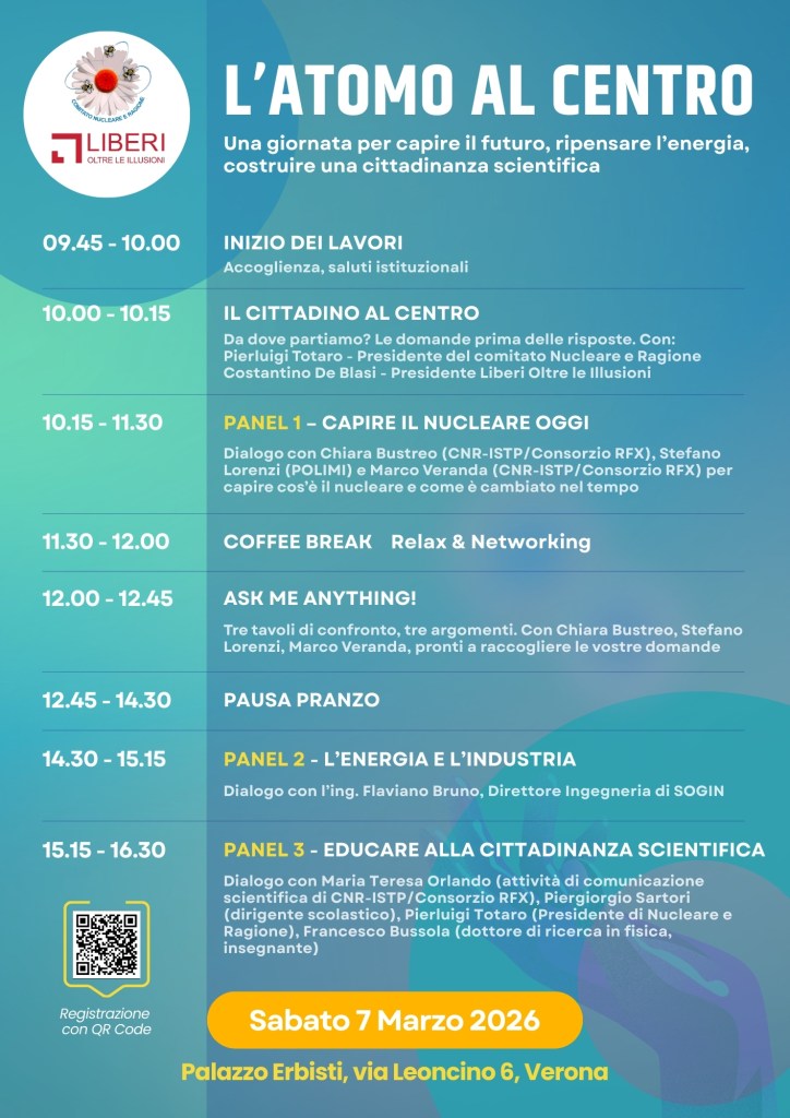L’iniziativa è organizzata da Liberi Oltre le Illusioni e dal Comitato Nucleare e Ragione, due realtà impegnate nella promozione del pensiero critico, della divulgazione scientifica e di un dibattito pubblico informato sui temi dell’energia.