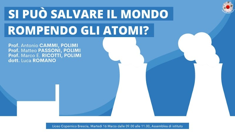 Domani martedì 16 marzo i nostri soci Proff. Antonio Cammi e Matteo Passoni, docenti del Politecnico di Milano e in particolare membri del Consiglio di Corso di Studi di Nuclear Engineering, interverranno durante l’assemblea d’istituto del Liceo Copernico di Brescia a proposito dell’energia nucleare. Ospite anche il Prof. Marco Ricotti, anch’egli docente Polimi nel corsoContinua a leggere “Si può salvare il mondo rompendo gli atomi? – con Liceo Copernico di Brescia”