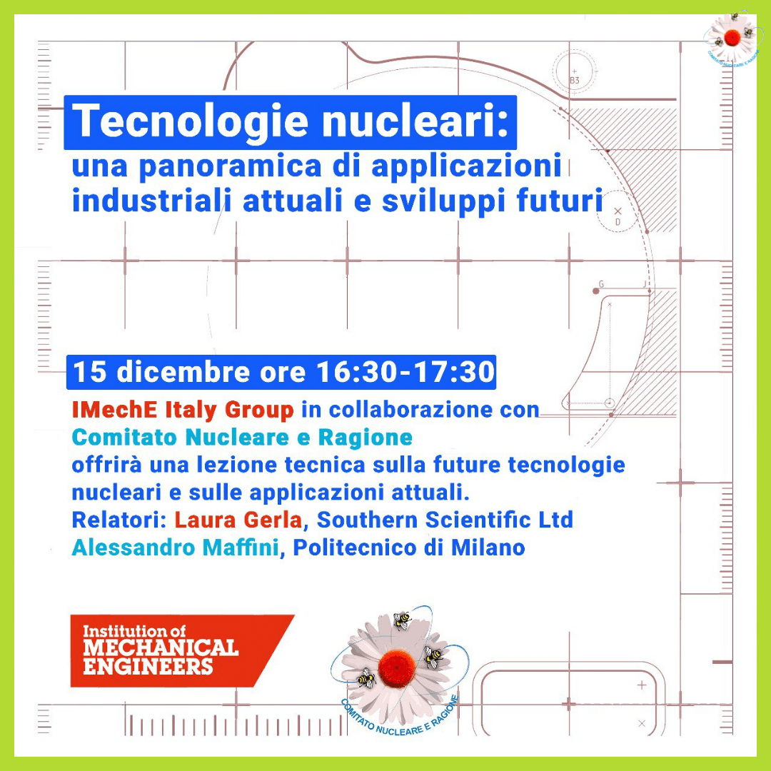 IMechE Italy Group in collaborazione con il Comitato Nucleare e Ragione offrirà oggi una lezione tecnica sulle future tecnologie nucleari e sulle applicazioni attuali. In effetti, la tecnologia nucleare non riguarda solo i reattori a fissione, ma copre diverse applicazioni come i controlli non distruttivi o i dispositivi per scansionare e rilevare rifiuti radiologici eContinua a leggere “Evento di formazione in collaborazione con l’IMechE”