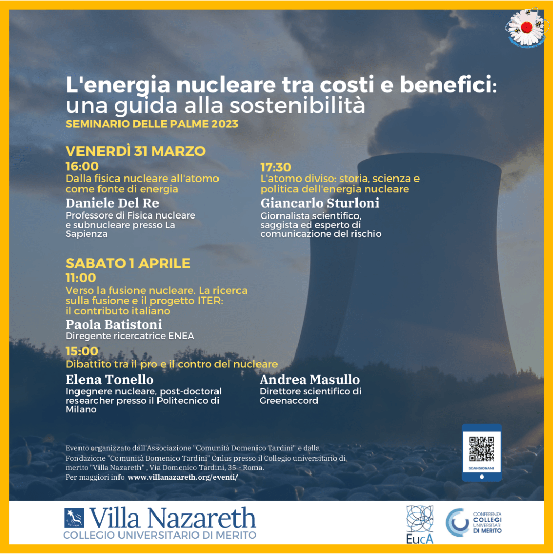 Nelle giornate del 31 marzo e del primo aprile, avrà luogo presso il Collegio Universitario di Merito “Villa Nazareth” , a Roma, una rassegna di seminari e dibattiti di tutto rilievo. Pubblichiamo qui il programma completo, segnalando in particolare il dibattito che avrà luogo sabato alle ore 15:00, e che vedrà confrontarsi la nostra sociaContinua a leggere “Energia nucleare tra costi e benefici: una guida alla sostenibilità – Evento presso il Collegio universitario di merito “Villa Nazareth””