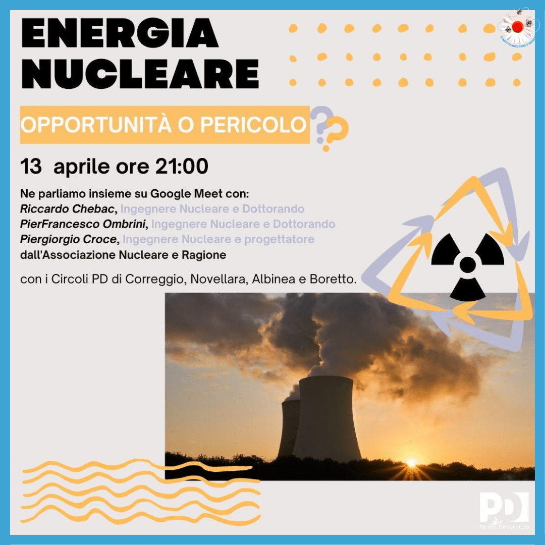 La crisi energetica che stiamo vivendo si affianca alla necessità di accelerare sulla transizione ecologica per evitare la catastrofe ambientale. L’energia nucleare può essere davvero la soluzione? I circoli PD di Novellara, Correggio, Boretto, Bagnolo e Albinea organizzano una serata di dialogo e formazione aperta a tutti e tutte per capire opportunità ed eventuali pericoliContinua a leggere “Energia nucleare: opportunità o pericolo?”
