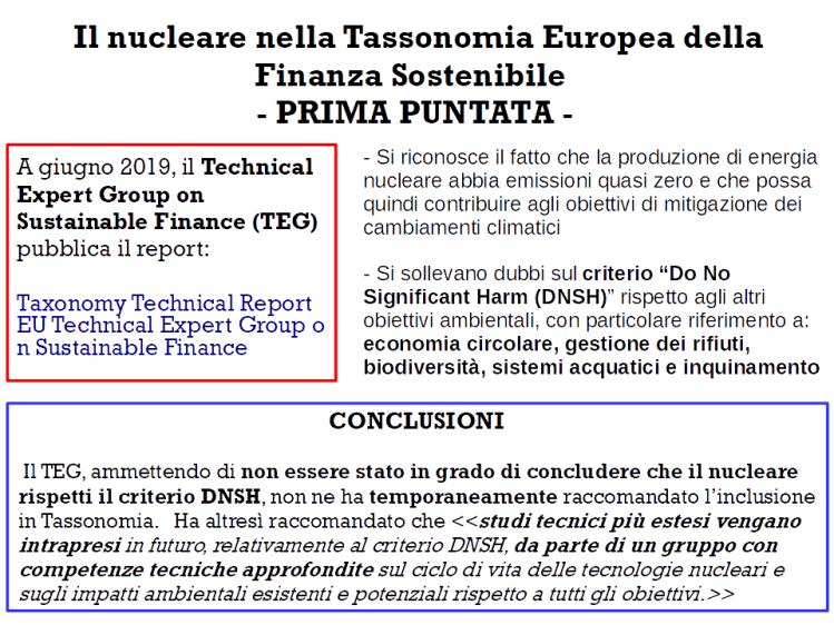 Inizialmente il nucleare era stato escluso dalla Tassonomia, poichè il Technical Expert Group on Sustainable Finance (TEG), pur riconoscendo il contributo dell’energia nucleare agli obiettivi di mitigazione dei cambiamenti climatici, aveva sollevato dei dubbi sul criterio “Do No Significant Harm (DNSH)” rispetto agli altri obiettivi ambientali, con particolare riferimento a: economia circolare, gestione dei rifiuti, biodiversità, sistemi acquatici e inquinamento.