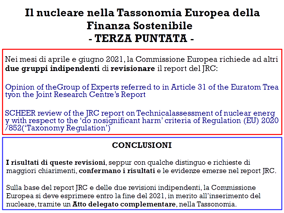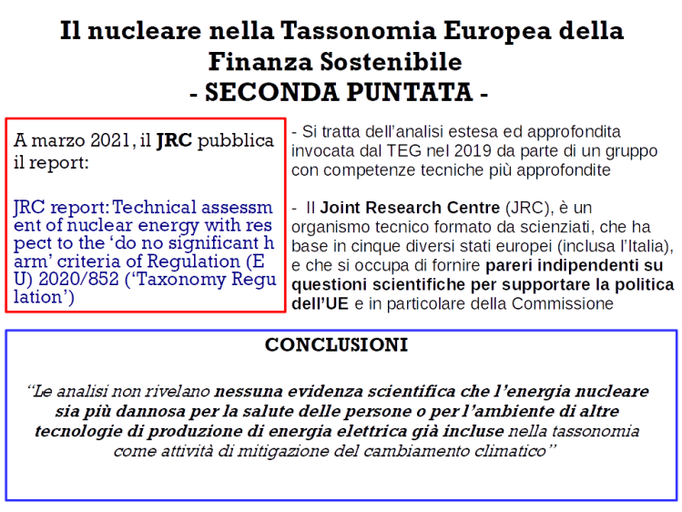 Il report finale del JRC conclude che <<le analisi non rivelano nessuna evidenza scientifica che l’energia nucleare sia più dannosa per la salute delle persone o per l’ambiente di altre tecnologie di produzione di energia elettrica già incluse nella tassonomia come attività di mitigazione del cambiamento climatico.>>.