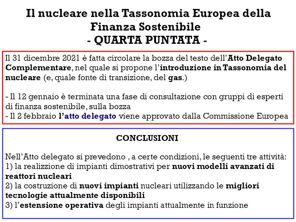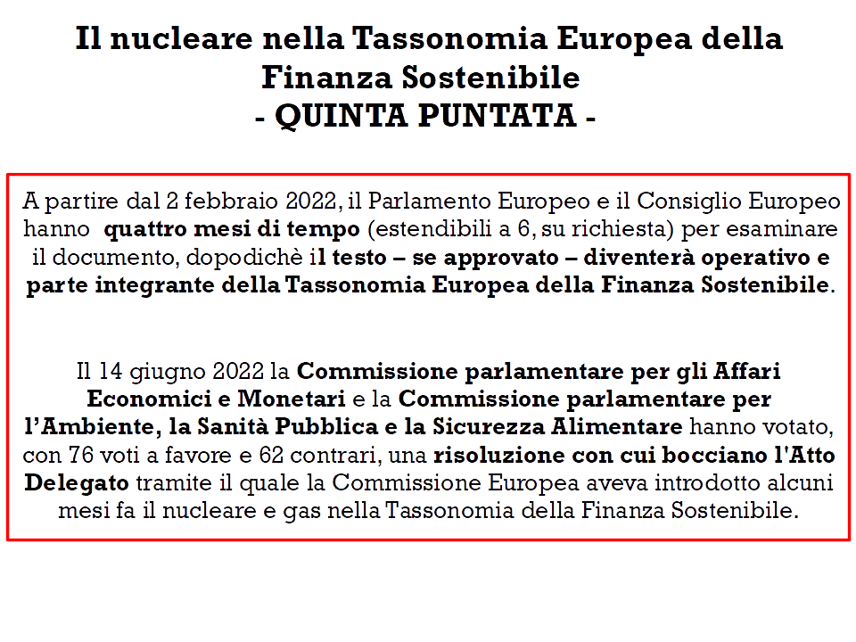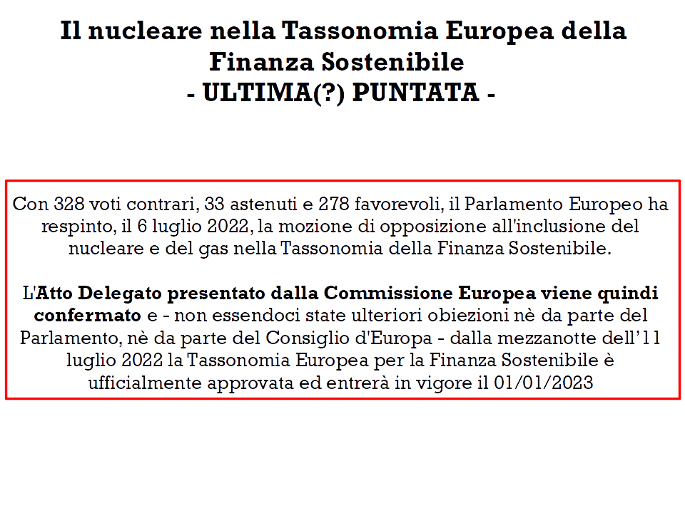 Di conseguenza, la nuova versione della Tassonomia Europea per la Finanza Sostenibile, nel quale il nucleare risulta essere presente, è stata approvata ed è entrata ufficialmente in vigore il 01/01/2023.
