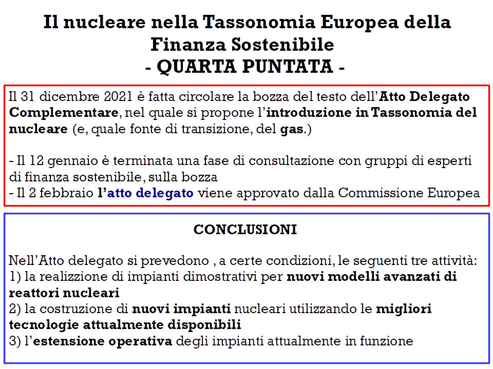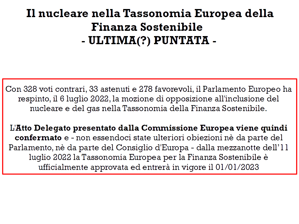 Di conseguenza, la nuova versione della Tassonomia Europea per la Finanza Sostenibile, nel quale il nucleare risulta essere presente, è stata approvata ed è entrata ufficialmente in vigore il 01/01/2023.